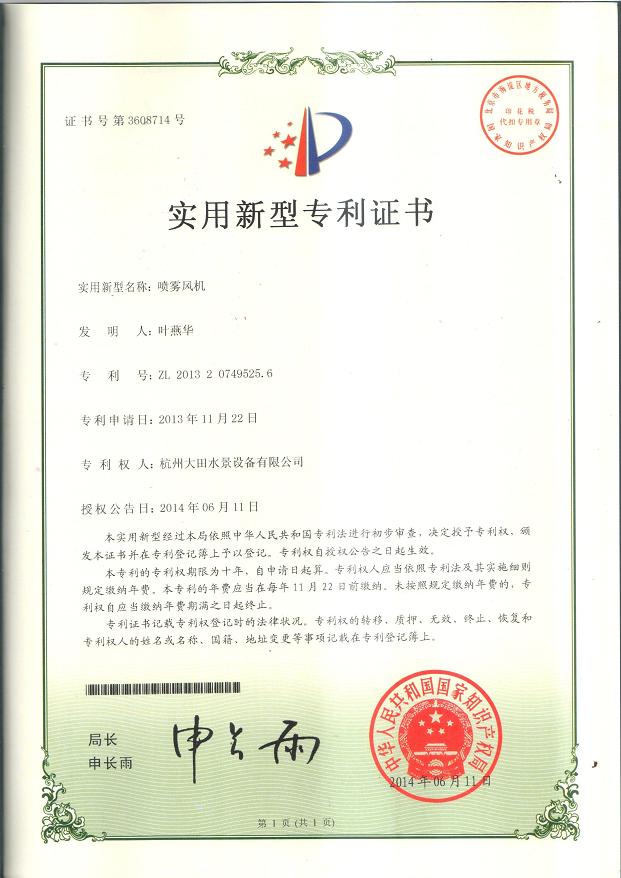 噴霧風(fēng)扇實用性國家專利通過審批